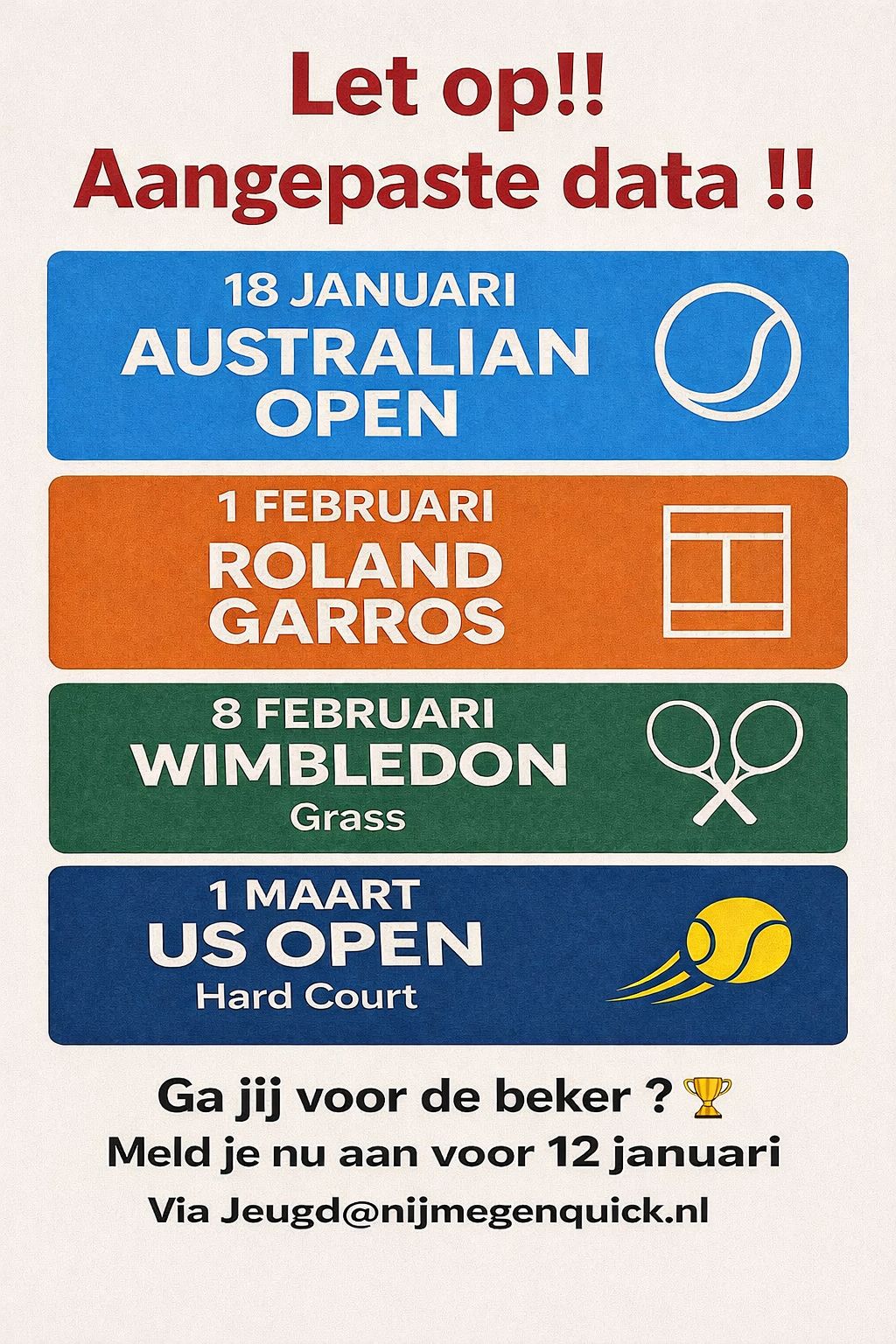 Allereerst de allerbeste sportieve wensen vanuit de Jeugdcommissie Nijmegen Quick. Het is weer zover, De Grand Slams gaan beginnen…Ben jij de Grand Slammer van 2026?